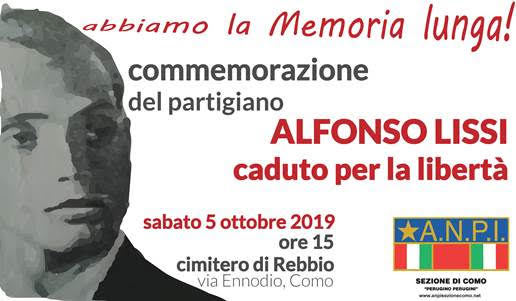 sabato 5 ottobre 2019 ore 15 presso il cimitero del quartiere di Rebbio (Como) in via Ennodio, alla commemorazione del compagno partigiano Alfonso Lissi, caduto durante lo scontro a fuoco contro i militi fascisti nella cosiddetta “battaglia di Lenno” il 3 ottobre 1944. Deporremo un omaggio floreale e terremo una breve orazione. Con l’occasione, ricorderemo idealmente tutte le partigiane e i partigiani caduti per la libertà e in special modo Erminio Lissi, partigiano combattente comasco.