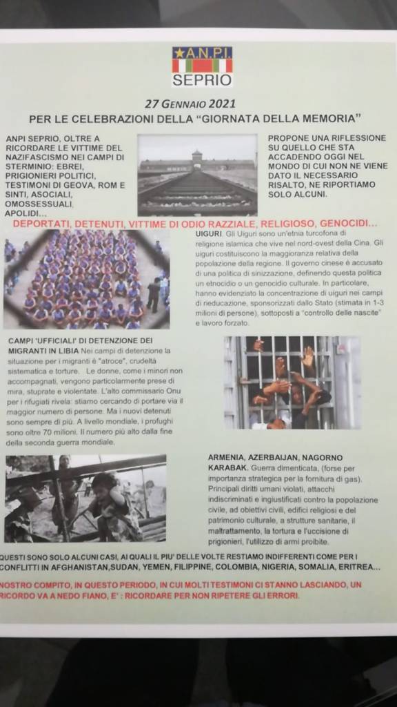 La sezione del Seprio ha preparato invece una locandina per far conoscere le vittime dei campi di concentramento nazisti: ebrei, oppositori politici, rom e sinti, disabili, omosessuali, testimoni di Geovah, asociali e per proporre una riflessione su quanto di analogo sta accadendo oggi nel mondo.