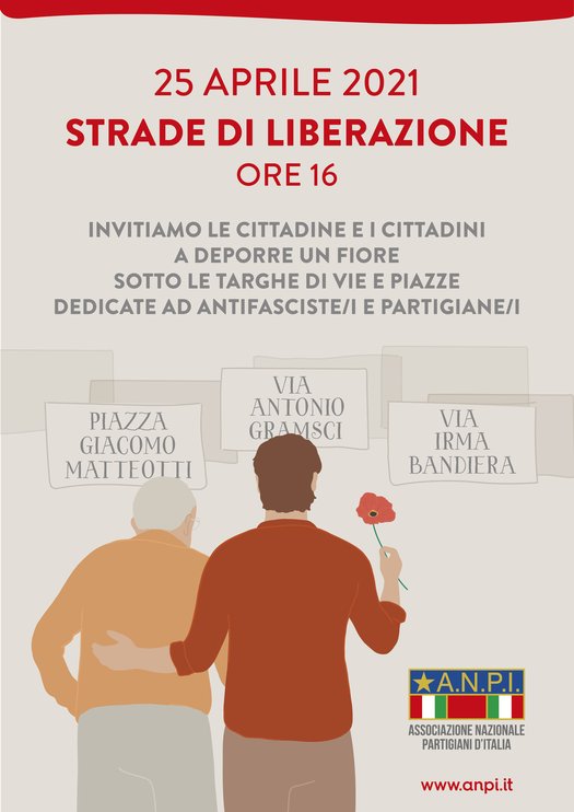 L’ANPI invita le cittadine e i cittadini a deporre un fiore, alle ore 16 del 25 aprile, sotto le targhe delle vie e delle piazze dedicate ad antifasciste/i e partigiane/i. Aderiscono Arci, Articolo 1, Cisl, Fiap, Massimo Ghini e 6000sardine.
