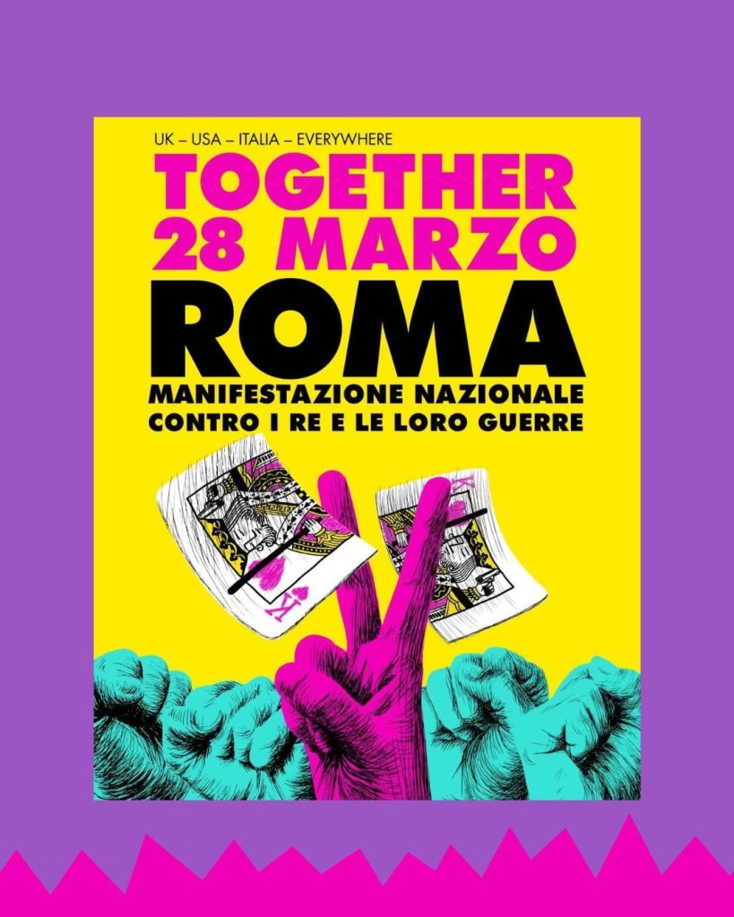 Together fa parte di una mobilitazione internazionale promossa dal movimento No Kings, che in diverse città del mondo porterà in piazza chi rifiuta la guerra come destino inevitabile.