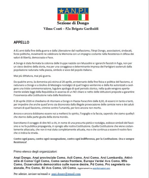 DOMENICA 26 APRILE, TUTTI A DONGO! Scopri di più da ANPI - Comitato Provinciale di Como ETS Abbonati per ricevere gli ultimi articoli inviati alla tua e-mail. Digita la tua e-mail... Iscriviti Condividi: Condividi su X (Si apre in una nuova finestra) X Condividi su Facebook (Si apre in una nuova finestra) Facebook Mi piace Caricamento... Correlati