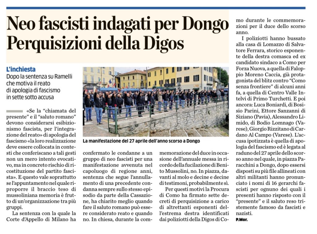 La Procura di Como ha firmato sette decreti di perquisizione a carico di altrettanti esponenti dell’ estrema destra identificati dai poliziotti della Digos durante le commemorazioni dello scorso anno a Dongo e a Giulino di Mezzegra.