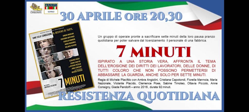 Giovedi 30 aprile, alle ore 20,30 presso la Biblioteca del Centro Civico di Carbonate potrete assistere alla proiezione di un bellissimo film di Michele Placido, 7 MINUTI. Undici lavoratrici di una fabbrica tessile devono decidere se accettare di rinunciare a 7 minuti della loro pausa pranzo.