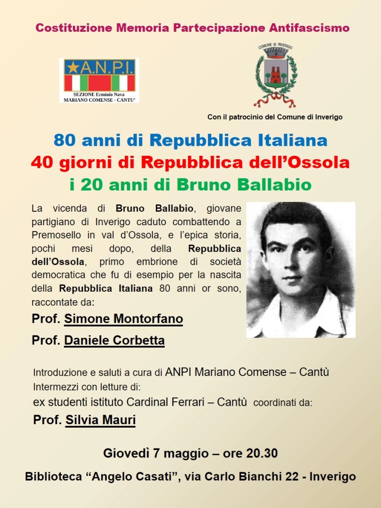 Presso la Biblioteca A.Casati, via Carlo Bianchi, 22 ANPI Mariano Comense – Cantù Erminio Nava ricorderà Bruno Ballabio, giovane partigiano caduto a Primosello in Val d’ Ossola.