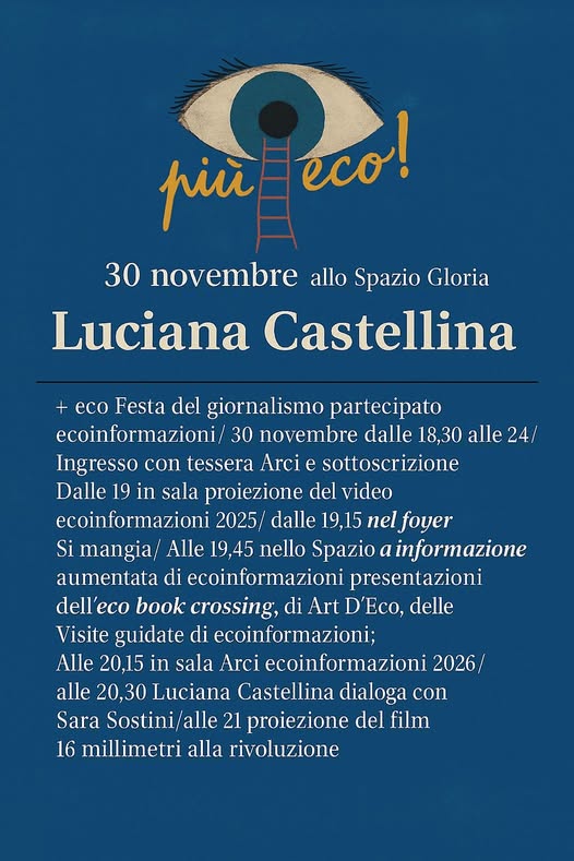 Ecoinformazioni, la testata indipendente senza né padrini né padroni, che da trenta anni illumina con cronache e approfondimenti i temi della Pace, della nonviolenza, dei Diritti, della politica per la libertà delle persone e dei popoli, dell’ ambiente, festeggia il suo straordinario 2025 con un appuntamento domenica 30 novembre per incontrarci, ragionare sul 2025 di Ecoinformazioni e sulle proposte in cantiere nel 2026. Sarà presente la compagna Luciana Castellina, presidente onoraria dell’ Arci Nazionale, che dialogherà con Sara Sostini, codirettrice di Ecoinformazioni e presenterà il film di Giovanni Piperno ” 16 millimetri alla Rivoluzione”.