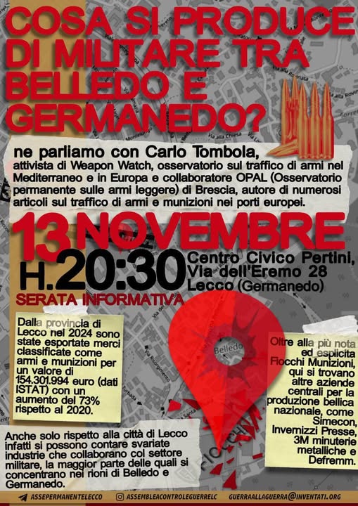 COSA SI PRODUCE DI MILITARE FRA BELLEDO E GERMANEDO? Incontro con Carlo Tombola, attivista di Weapon Watch, a Lecco, presso il Centro Pertini in via dell’ Eremo 28.