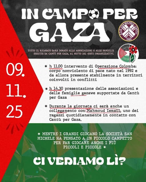 L’associazione Cantù per Gaza e A.S.D. San Michele organizzano domenica 9 novembre, al campo sportivo di via Andina a Cantù un torneo misto 5vs5 in sostegno della Palestina.