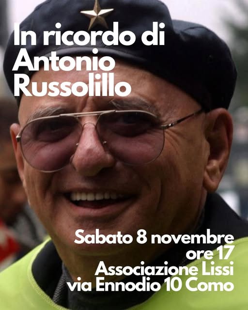 Sabato 8 novembre, alle ore 17,00 ricorderemo il caro compagno Antonio Russolillo, recentemente scomparso, presso l’ Associazione Lissi in via Ennodio, 10 Rebbio (Como).