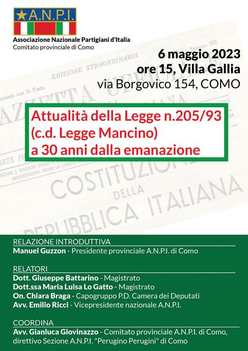 A seguito di numerosi episodi che si sono verificati nella nostra provincia, ultimo dei quali l’assoluzione degli Skinheads che hanno fatto irruzione al Chiostrino di Santa Eufemia, la sezione Anpi di Como ha organizzato un importante convegno in presenza di Magistrati, avvocati, rappresentanti delle Istituzioni e politici. Sarà inoltre presente l’ avvocato Emilio Ricci, Vice Presidente dell’ Anpi Nazionale.