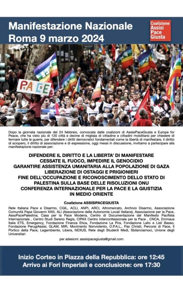 Il 9 marzo manifestazione nazionale a Roma: difendere il diritto e la libertà di manifestare; cessate il fuoco a Gaza; impedire il genocidio; garantire assistenza umanitaria alla popolazione; liberare ostaggi e prigionieri; fine dell’occupazione; riconoscimento dello Stato di Palestina sulla base delle risoluzioni ONU; conferenza internazionale per la pace e la giustizia in Medio Oriente. L’ANPI è tra i promotori.