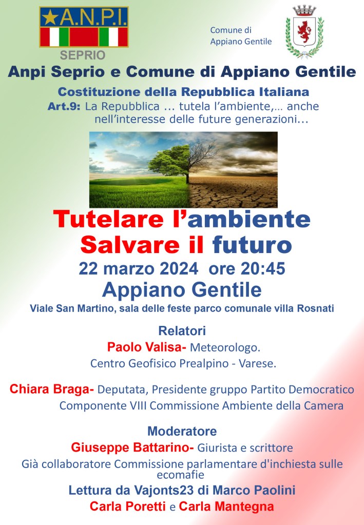 Iniziativa di Anpi Seprio e Comune di Appiano Gentile, con interventi di Paolo Valisa, metereologo del Centro Geofisico Prealpino, Chiara Braga, capogruppo alla Camera del PD, Giuseppe Battarino, giurista e scrittore.